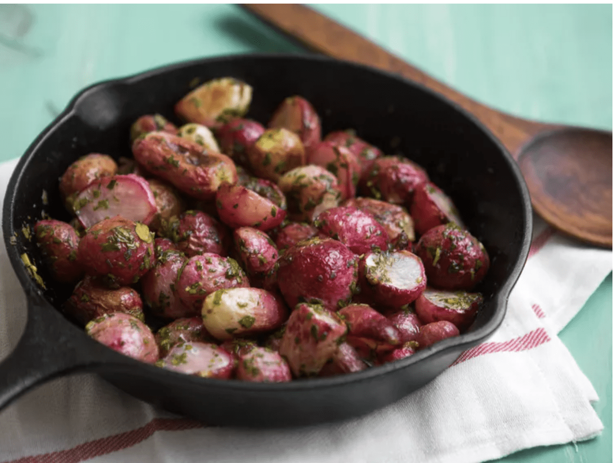 Add 2 minced garlic cloves and the butter, toss to combine, and rearrange into a single layer (it’s OK if some radishes end up cut-side up). Return to the oven and roast until the garlic is golden brown, 8 -12 minutes more.