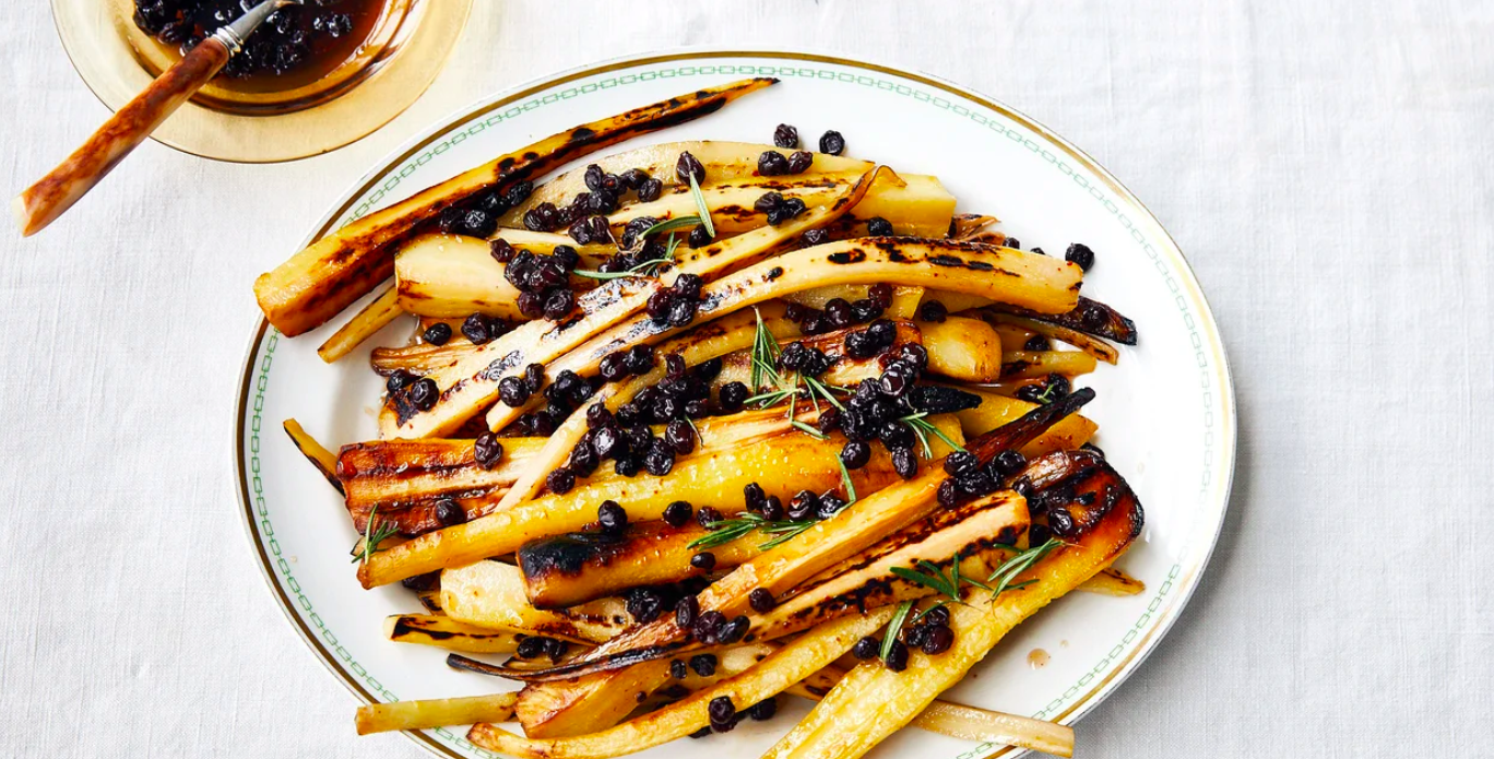 Welcome to root vegetables reinvented. Sturdy parsnips soften in a warm bath of olive oil, then get seared and bejeweled with pickled currants. It’s hard to know if a parsnip will have a woody core, but generally speaking, small ones are tender throughout. Worst case scenario? Trim the tough centers before cooking.