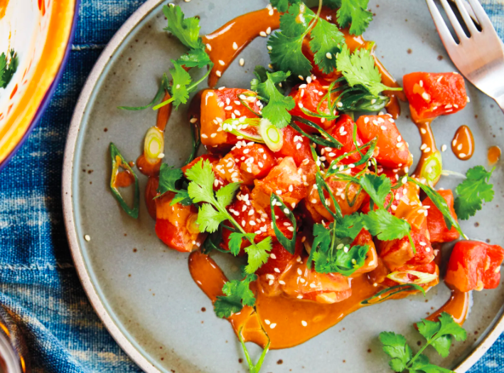 To serve, toss the watermelon with sauce; taste and season with salt as needed. Top with the scallions and cilantro.