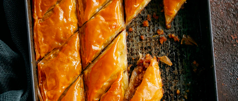 This comforting autumnal-style baklava combines a filling of fresh orange zest and spices with blended walnuts and is drenched in a gloriously sticky stem ginger syrup