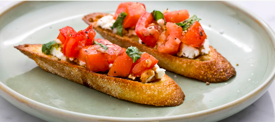 Scatter a few fresh basil leaves over the bruschettas to serve.