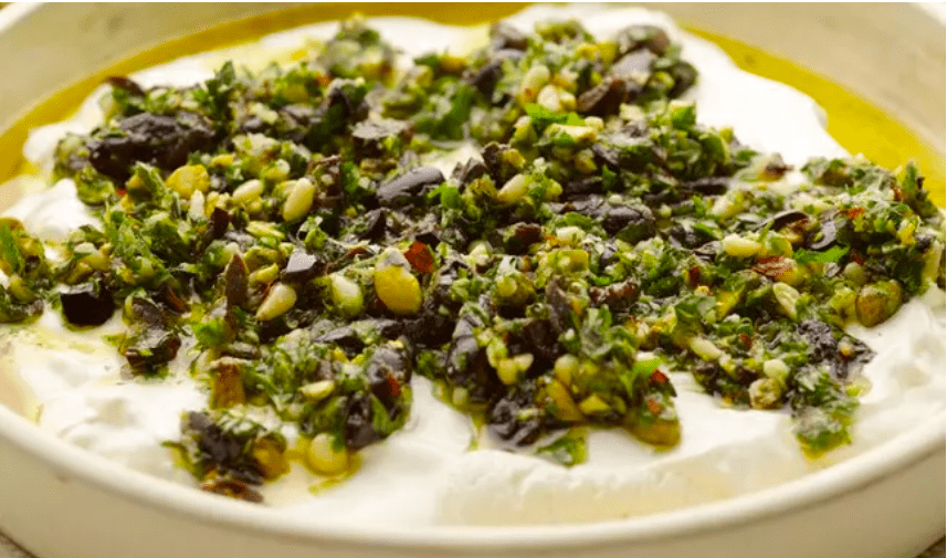 Spoon the olive mix over the labneh clearing about 2cm away from the edge (you don’t need to use the whole quantity if you want your labneh a bit milder). Sprinkle with chili and serves with wither torn bread chunks or crackers.