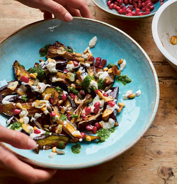 Lay the eggplant on a serving dish (holding back the garlic chips for the top).