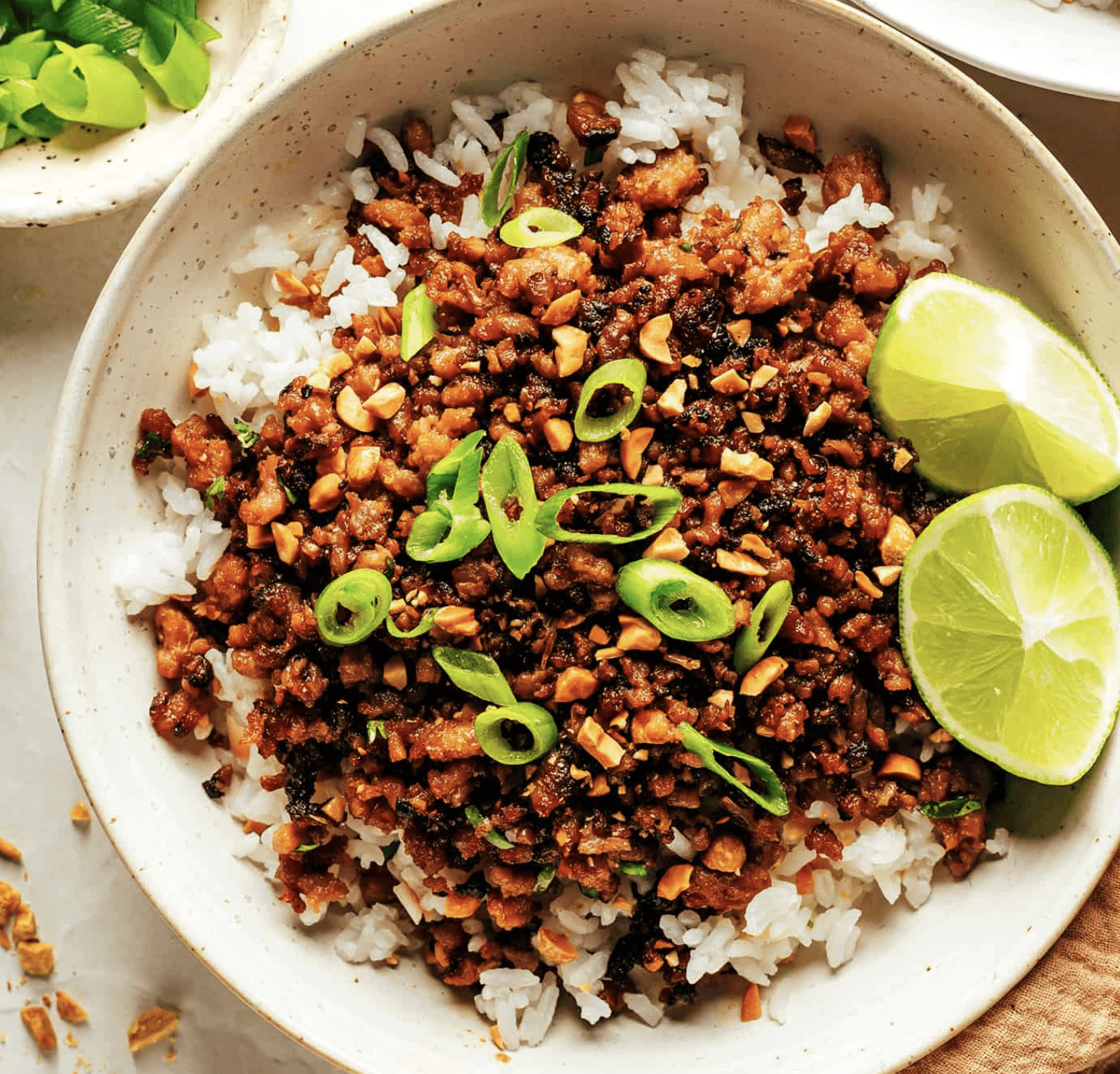 toppings: chopped peanuts, extra lime wedges, chopped fresh herbs (cilantro, mint, and/or Thai basil)