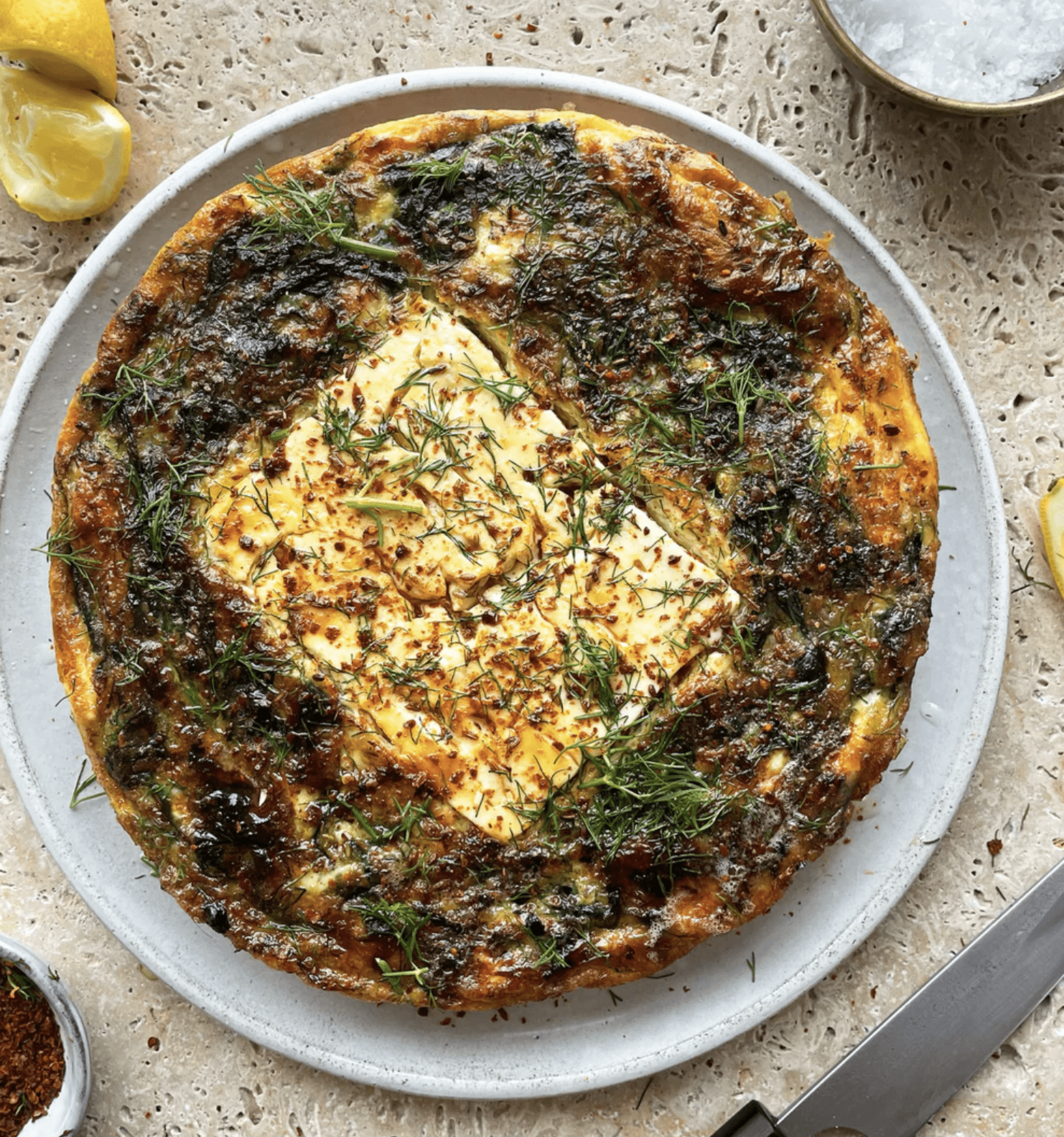 If ever there were a way to feature feta, it’s this frittata, where a block of the cheese sits perfectly in the middle. I consider it a breakfast dish, but it also works just as well as a summer lunch or as part of a picnic spread.