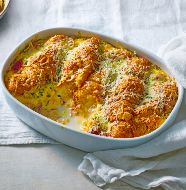 Arrange half the halved croissants, cut-side up, in the baking dish. Scatter over half the cheese and all the ham, then arrange the rest of the halved croissants, cut-side down, on top.