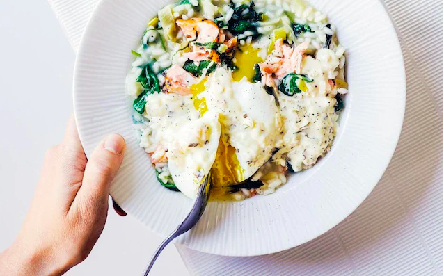 “This is every bit as wonderful as it sounds: an Italian torta di riso, refracted through the prism of someone who loves a bowl of very British rice pudding. The Italians like to stud their rice cake with candied peel, bake it in a tin lined with breadcrumbs or crushed amaretti, and eat it cold; I sprinkle mine with nutmeg, and serve it warm, most frequently with a jewel-bright jam sauce. But it’s also lovely with poached fruit and I can’t help thinking it would be fabulous with a bit of golden syrup drizzled on top, too.