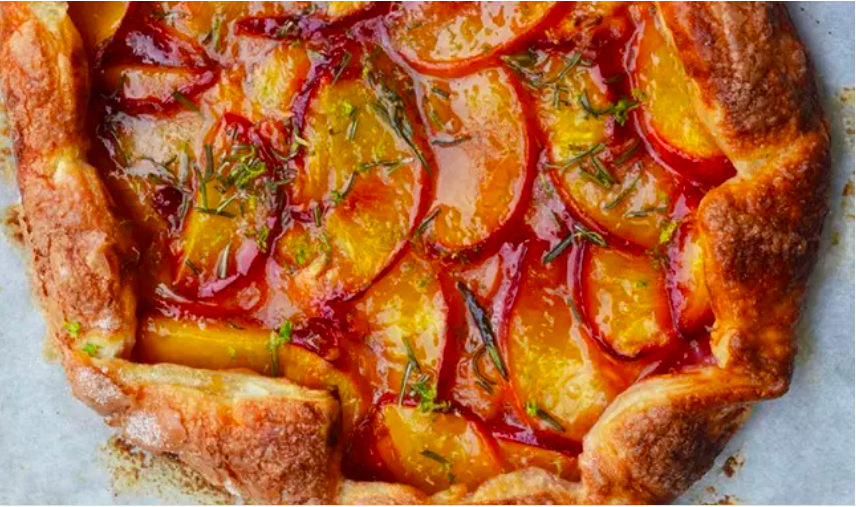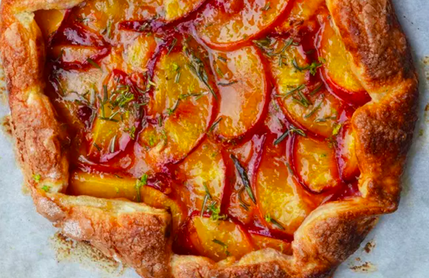 While the galette is baking, whisk the cornflour into the reserved peach syrup. Simmer over a medium-high heat until it thickens to the consistency of honey (about two minutes), then pour over the peaches. Sprinkle the rosemary leaves on top and return the galette to the oven for 15 minutes, until the pastry is golden-brown and the filling bubbling.