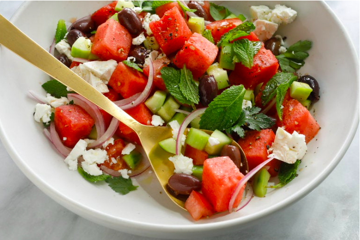 In a large bowl combine 3 cups cubed watermelon; 2 large ripe tomatoes, chopped; 1 medium cucumber, peeled, seeded and chopped; 1 small red onion, sliced; 1/2 cup pitted Kalamata olives; 1/2 cup crumbled feta; and the chopped parsley and mint. Drizzle with olive oil and red-wine vinegar, sprinkle with salt and pepper, toss and taste/adjust for seasoning before serving.