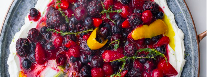 Spread the labneh out on a large platter. Spoon over the berries, then sprinkle with the lime zest. Drizzle with 2 tablespoons of the infused oil, along with a couple of the orange strips and the extra picked thyme leaves.