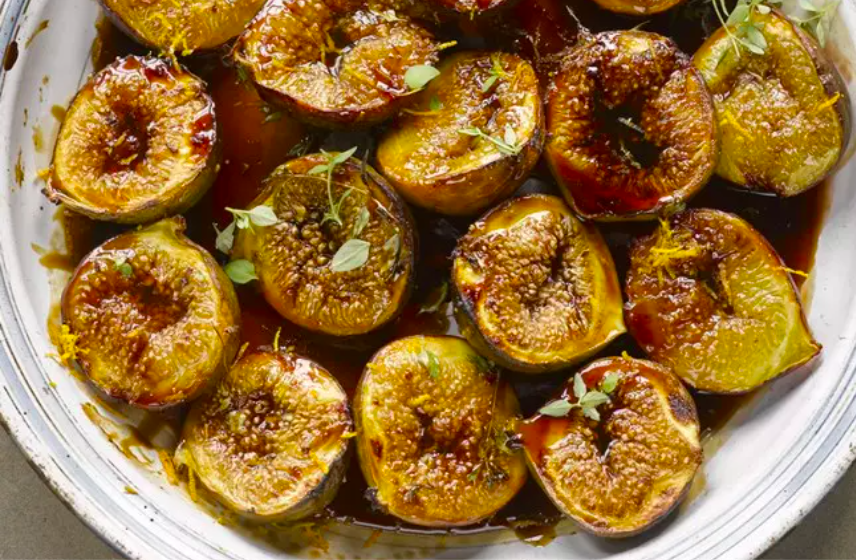 Transfer the hot figs to serving plates and spoon over any leftover syrup from the baking tray, then drizzle over the sauce reduction and sprinkle with picked thyme leaves. Place a spoonful of the yoghurt cream on the side or on the figs and sprinkle over the remaining orange zest. Serve at once.