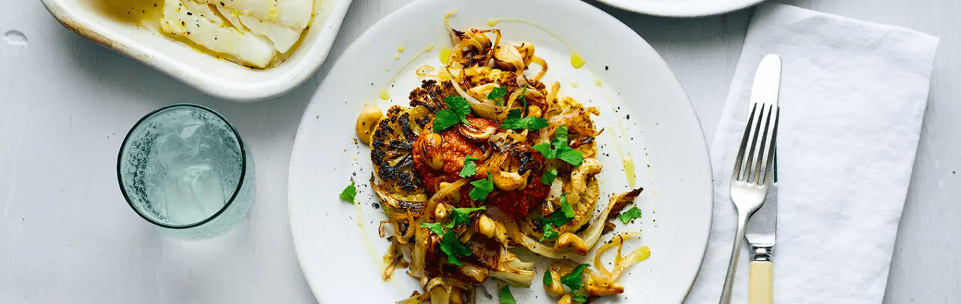 Whizz to a smooth purée. Serve the cauliflower steaks topped with the purée, extra onion mixture and a scattering of cilantro leaves. This is great served with roasted fish, couscous or salad