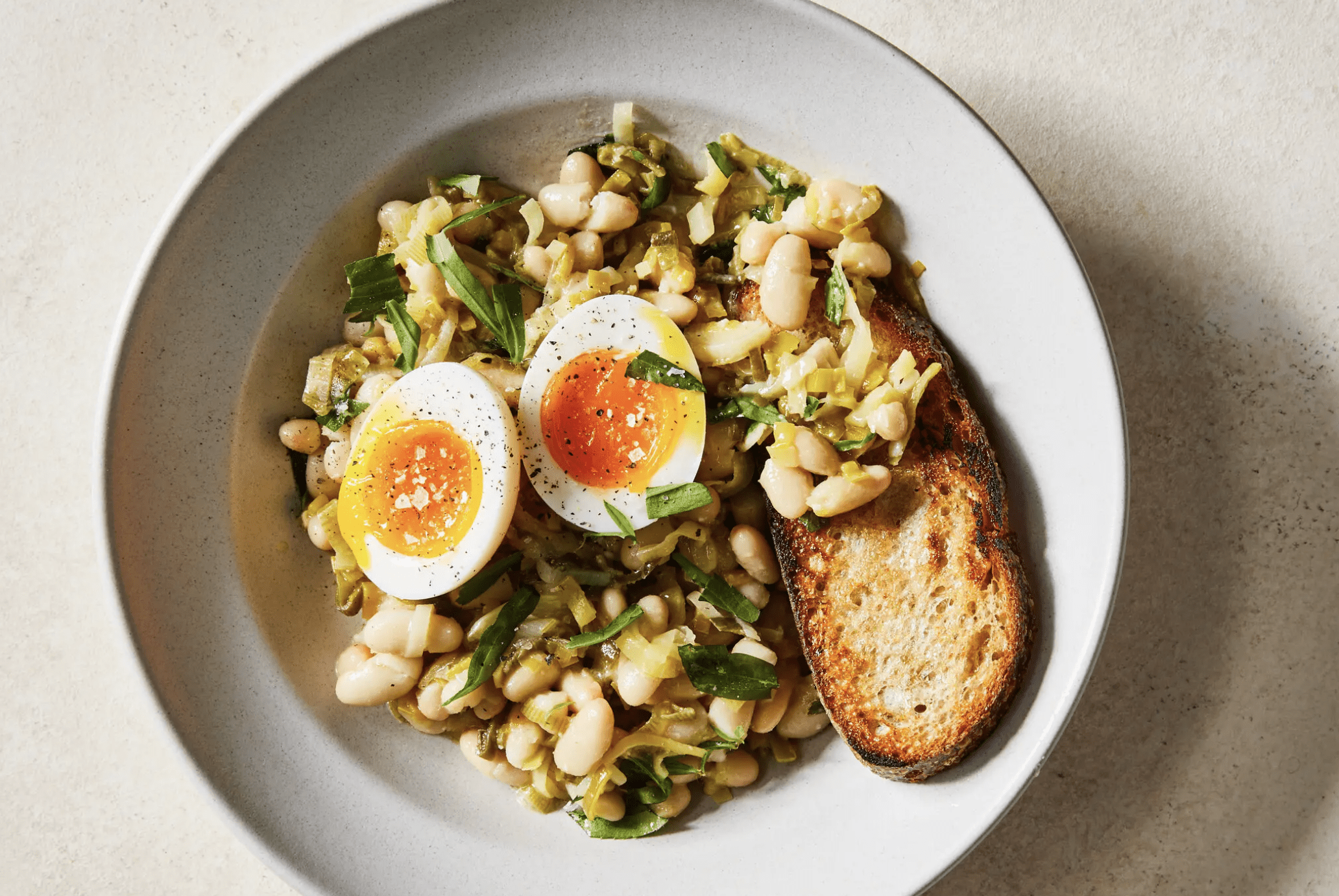 Divide the leeks and beans among bowls and drizzle each with olive oil. Top with a halved jammy egg and finish with the remaining herbs. Serve with toast, if desired.