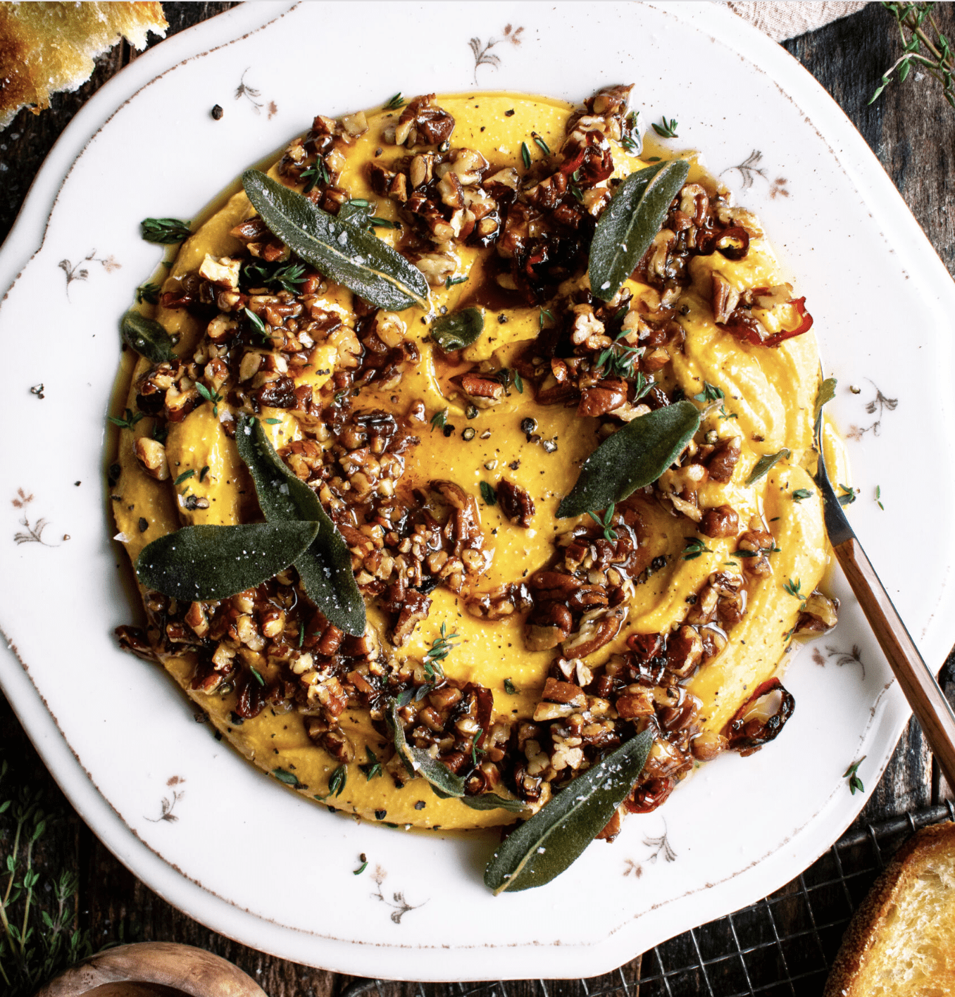 Spoon the dip into a shallow serving bowl. Top with freshly cracked black pepper. Spoon the honey pecan topping over top and garnish with the fried sage leaves.