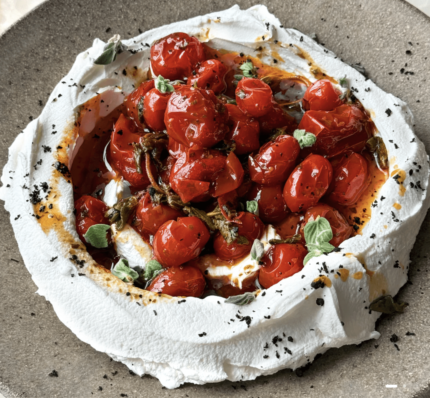 Once you’ve spread the labneh across a plain, flat plate, make a well in the centre for the tomatoes, letting the glossy oil spill over the edges. If you’re feeling organized, make double the tomatoes and blitz half with their juices for an instant pasta sauce that keeps beautifully in the fridge.