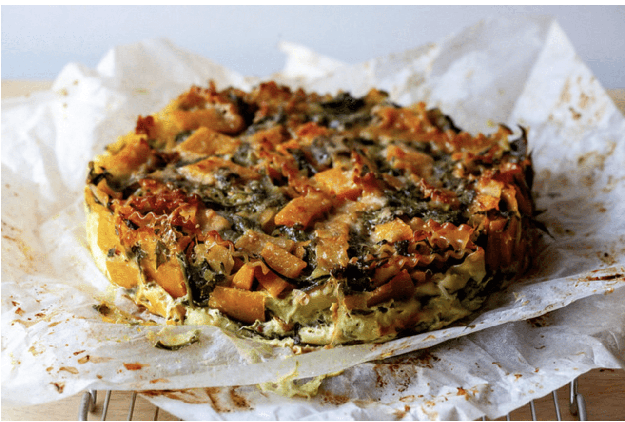 “This is not a usual pasta bake. We do not boil the noodles. We do not make or buy a sauce. We do not roast the winter squash or even sauté the greens. We throw every single ingredient raw into a big bowl for mixing and pour that into a parchment-slung springform (or equivalently-sized pan) pan and bake it for 90 minutes. That’s the rub; it takes a long time to cook. But this time is entirely hands-off, save removing the foil midway. You won’t be scrubbing pots, as the sum of your dishes to wash will be a cutting board, knife, whisk, grater, and a bowl.