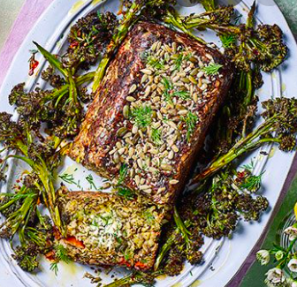 Serve the nut roast on a platter alongside the broccoli. Drizzle with olive oil and top with the dill fronds.