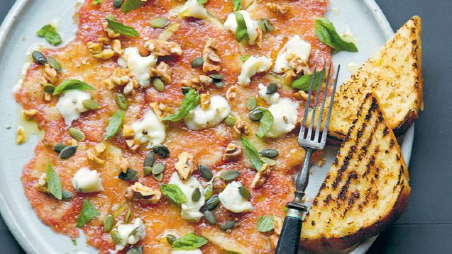 Drizzle the vinegar and olive oil all over, then sprinkle with the pepitas, salt and pepper. Serve with toasted bread on the side.