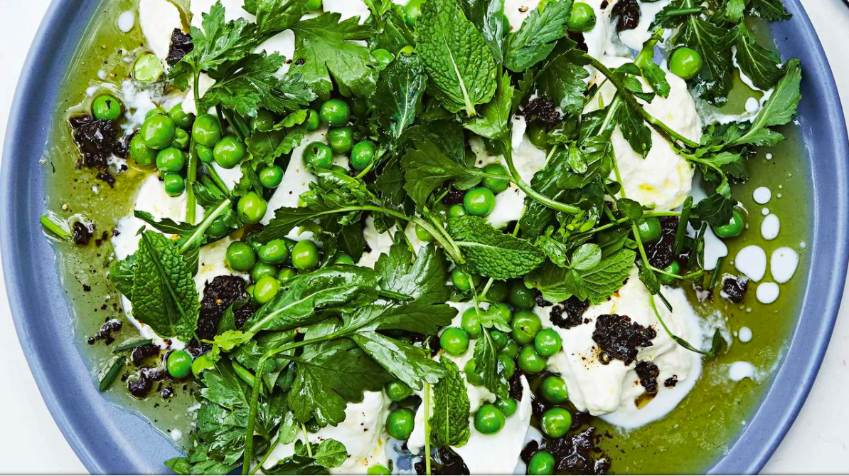 Tear the burrata into pieces and arrange on a large serving platter or in a shallow bowl (you can also cut the burrata, but tearing it is much easier). Scatter the crushed peas on and around the burrata and top with the olive mixture, followed by the spicy greens and herbs.