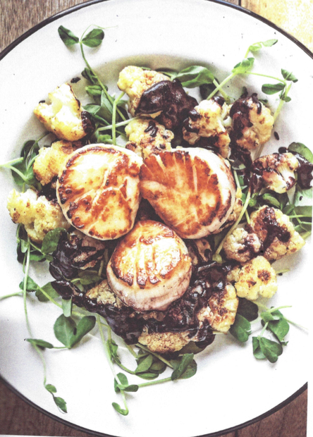 Scatter the pea shoots on a serving platter. Sprinkle the roasted cauliflower over the pea shoots, then lay the scallops on top.