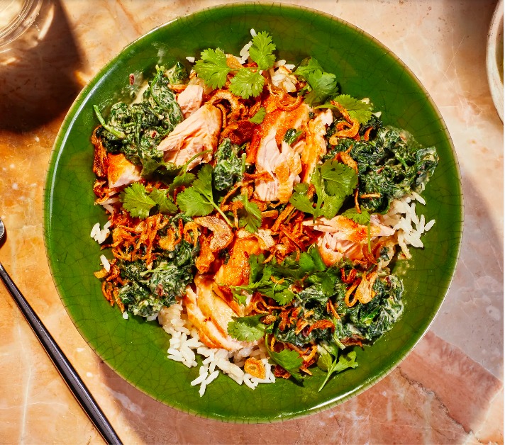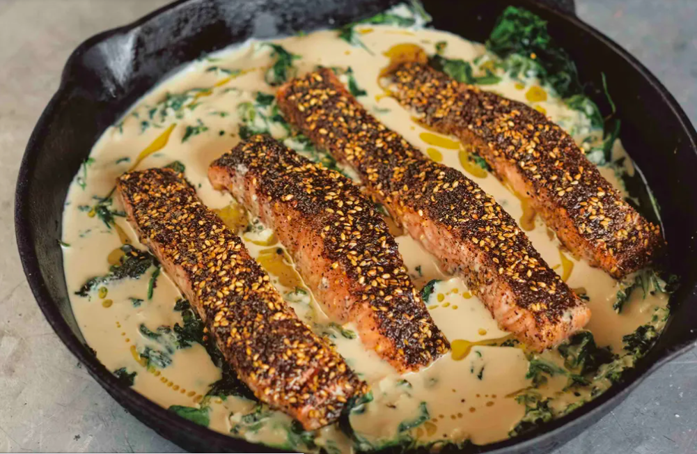 This easy salmon tray bake packs a real punch thanks to the flavorful marinade it cooks in. The soy sauce is a bit of a non-Middle Eastern wild card, but contributes a welcome umami flavor and Tunisian harissa adds a nice subtle spice to this dish.