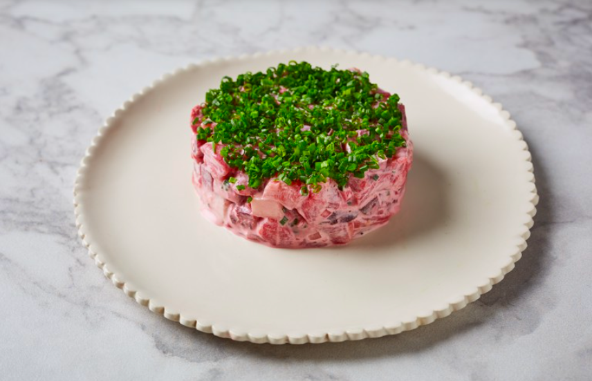 Use a metal ring to plate up neat piles of the tartare and sprinkle a layer of chopped chives over the top. Serve with buttered toast or on its own for a lighter starter